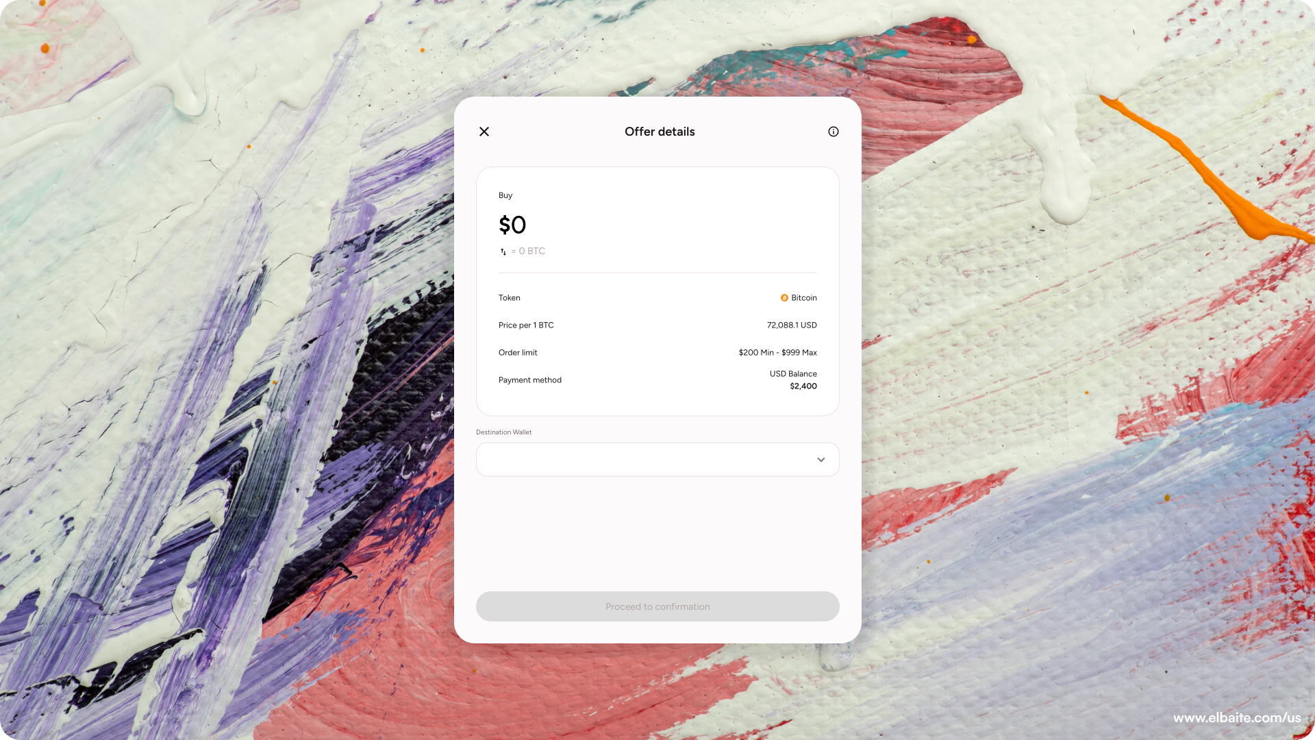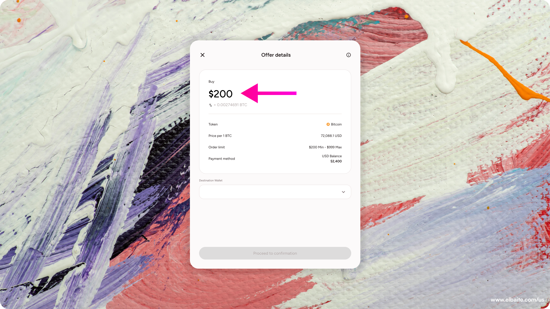Next you must select which wallet you want your crypto to arrive in. If you are looking at an offer for Bitcoin, then the wallet dropdown list should only show Bitcoin addresses from your crypto address book.