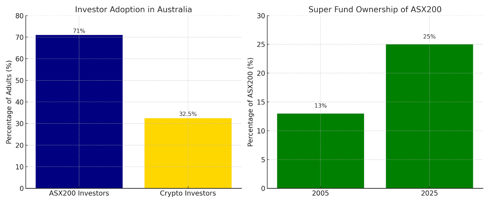 Superannuation funds are a major source of capital for the ASX200, holding just under 25 percent of the index. This is down from 13 percent in 2005 as more capital is being invested offshore. Bitcoin is still held by fewer Australians, but adoption continues to grow both locally and globally.